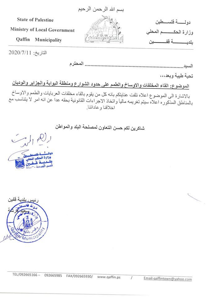 بلدية قفين تؤكد اتباع الإجراءات القانونية بحق المخالفين وملقيي المخلفات والأوساخ على الشوارع.