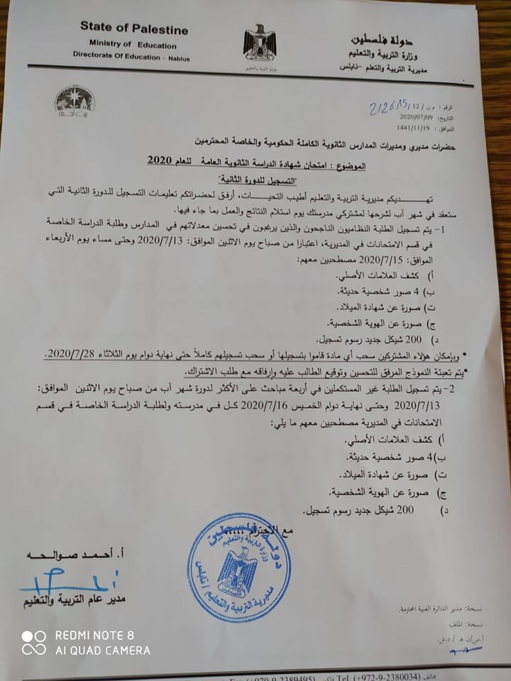 مديرية التربية والتعليم في نابلس تنشر آلية التسجيل للدورة الثانية بامتحان شهادة الثانوية العامة لعام 2020.