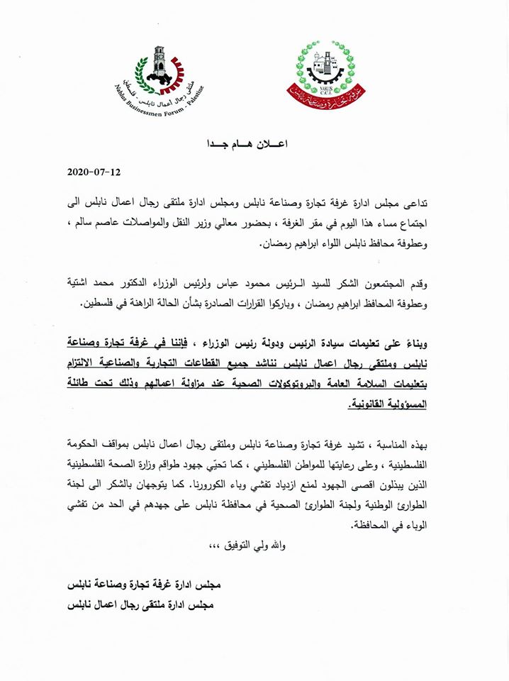 غرفة تجارة وصناعة نابلس وملتقى رجال نابلس يجتمعون مع محافظ نابلس ويناشدون القطاعات التجارية والصناعية بالالتزام بالبروتوكولات الصحية عند مزاولة أعمالهم، تحت طائلة المسؤولية القانونية.