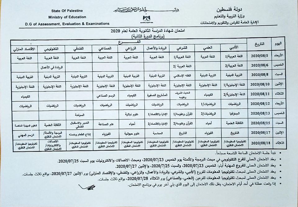 وزارة التربية والتعليم تنشر برنامج الدورة الثانية (امتحانات الإكمال) لطلبة التوجيهي.