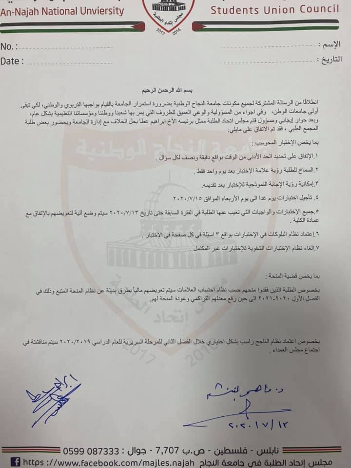 مجلس اتحاد طلبة جامعة النجاح يتفق مع إدارة الجامعة لحل الخلاف مع طلبة المجمع الطبي، بعد اعتراضهم على نظام ناجح راسب والمنح في الجامعة.