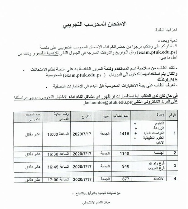 تعتمد الجامعات الفلسطينية النظام التعليمي الإلكتروني لاستمرار المسيرة التعليمية في ظل أزمة كورونا، جامعة خضوري تدعو الطلبة لتأدية الامتحان الموحسب التجريبي للتعرف على بيئة الاختبارات المحوسبة.