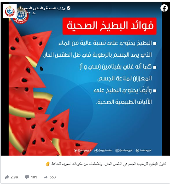 وكانت الصفحة الرسمية لوزارة الصحة والإسكان المصرية على موقع فايسبوك شاركت مع متابعيها منشوراً عن فوائد البطيخ، ومنها إمداد الجسم بالرطوبة في الأيام الحارة واحتوائه على فيتامينات (سي) و(أ) اللذان يقويان المناعة ضد الأمراض ومن بينها فيروس كورونا.