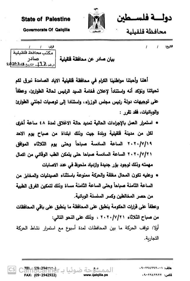 نظراً لازدياد الإصابات بفيروس كورونا، محافظ قلقيلية يعلن عن تمديد إغلاق مدينة قلقيلية وبلدة جيت لـ48 ساعة إضافية، ويصدر عدة قرارات.
