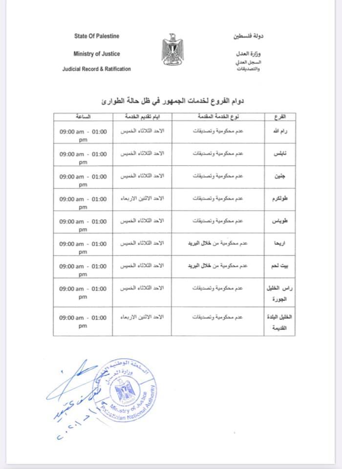 وزارة العدل تنشر أوقات دوام فروع المديريات لخدمات الجهور في ظل حالة الطوارئ.