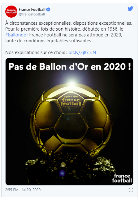 لا خليفة لميسي في هذا العامورأت فرانس فوتبول أن المساواة تقتضي منح الكرة الذهبية بناء على قواعد مقارنة متكافئة، وأن ذلك لن يكون ممكنا "في ظل وقف مواسم البعض بشكل قاطع" واستكمال مواسم آخرين، في إشارة إلى استئناف منافسات الدوري الإنجليزي والإسباني والألماني دون جمهور وتحت ظوابط صارمة، بينما توقف الدوري الفرنسي بالكامل.