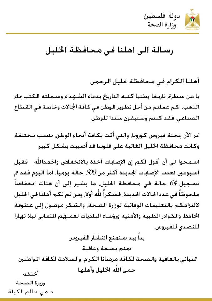 رسالة من وزيرة الصحة إلى أهالي الخليل