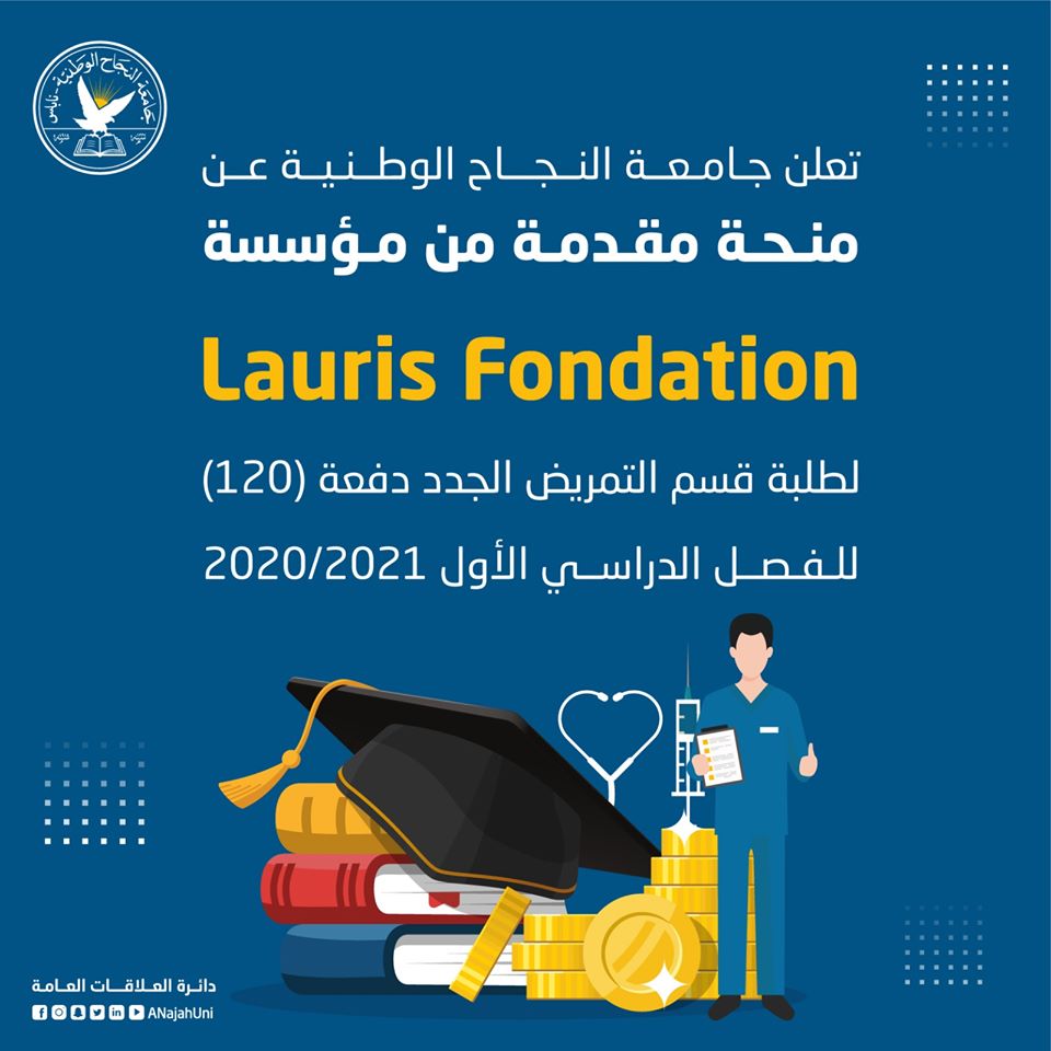 أعلنت جامعة النجاح، الأربعاء 29.7.2020، عن منحة مقدمة من مؤسسة Lauris Fondation لطلبة قسم التمريض الجدد دفعة (120)، للفصل الدراسي الأول 2020-2021.