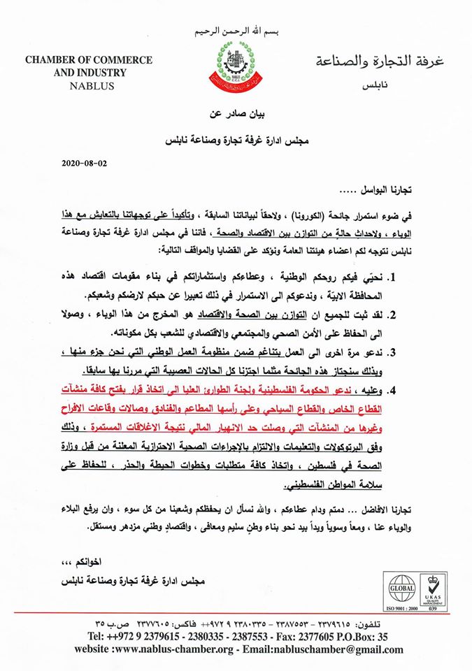 نظراً لاستمرار إغلاق بعض القطاعات بسبب كورونا، غرفة تجارة وصناعة نابلس تصدر بياناً تدعو الحكومة فيه لفتح كافة منشآت القطاع الخاص والقطاع السياحي وفق بروتوكولات الصحة.