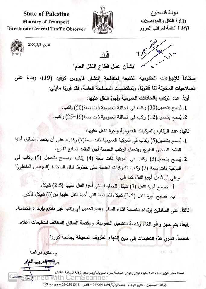 وزارة النقل والمواصلات تصدر تعليماتها بشأن السماح للمواصلات العامة بالعمل فوق شروط السلامة للوقاية من تفشي فيروس كورونا.
