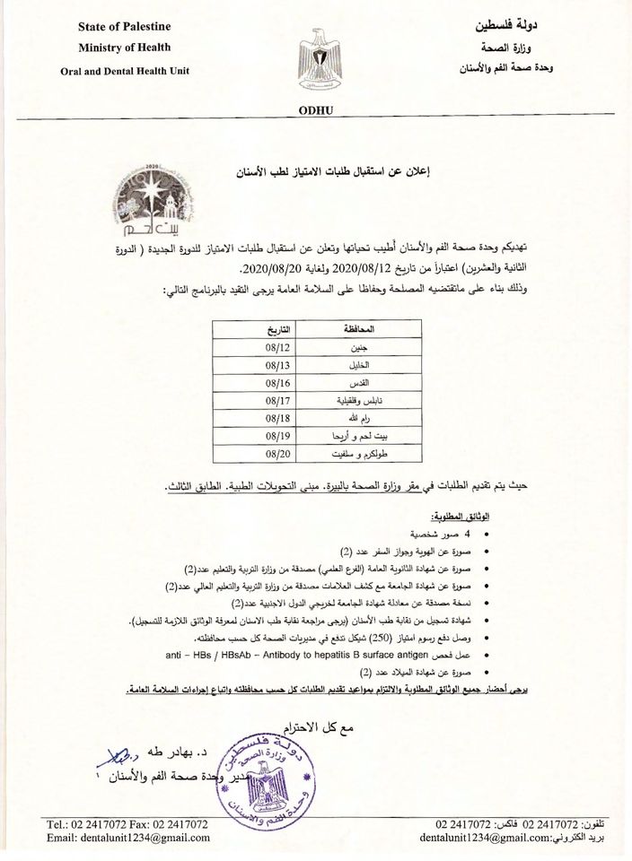 وحدة صحة الفم والأسنان في وزارة الصحة تعلن عن بدء استقبال طلبات الامتياز لطب الأسنان ضمن برنامج محدد.