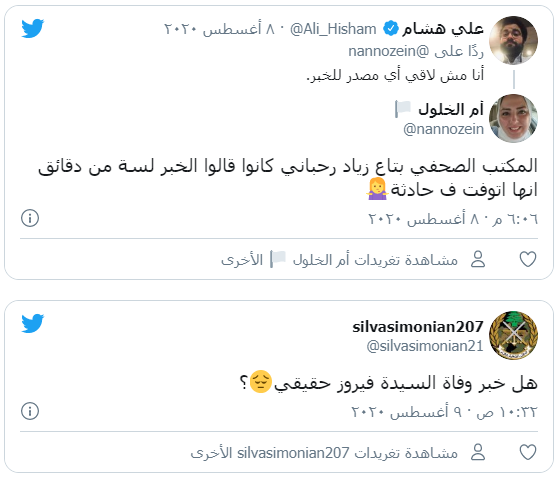 نفت ابنة فيروز، ريما الرحباني، شائعة وفاة والدتها، عبر تدوينة على حسابها الخاص في موقع فيسبوك، قائلة "إلى مُطلقي الشائعات الذين يظل لديهم رغبة ونفْسْ ووقت بكل الظروف مهما كانت سوداء يفبركوا الخبر ذاته! وكأنها رغَبات لديهم أكتر أنها مجرد إشاعات!"