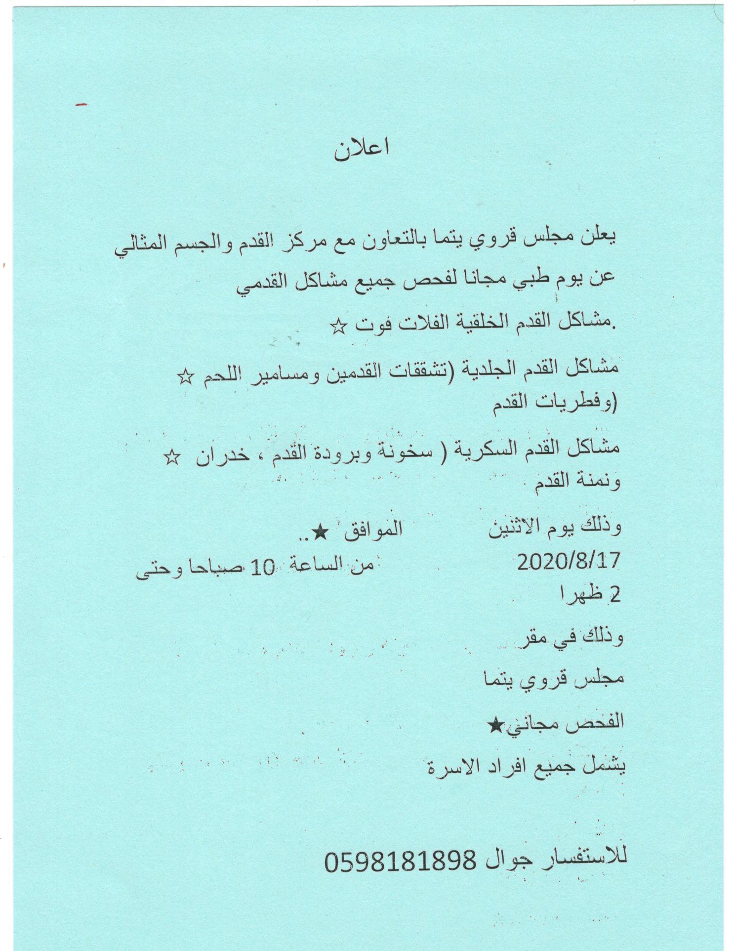 مجلس قروي يتما يعلن عن تنظيم يوم طبي مجاني لمشاكل القدم في البلدة.