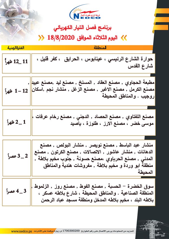 شركة توزيع كهرباء الشمال تنشر مواعيد فصل الكهرباء في نابلس وضواحيها، ليوم الثلاثاء 18.08.2020.