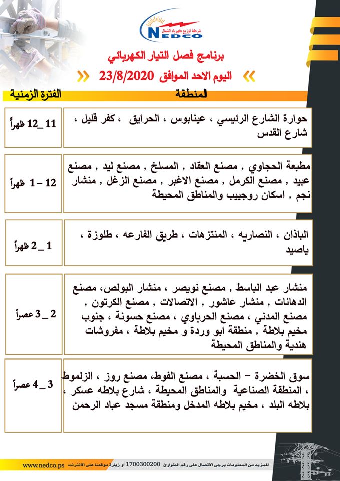 شركة توزيع كهرباء الشمال تنشر مواعيد فصل الكهرباء في نابلس وضواحيها، ليوم الأحد 23.08.2020.