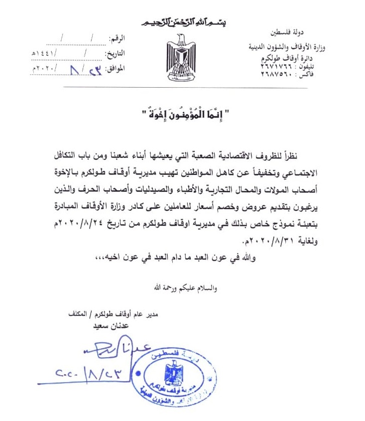 مديرية أوقاف طولكرم تهيب بأصحاب المحال والأطباء والصيادلة بتقديم عروض للعاملين بكادر وزارة الأوقاف.