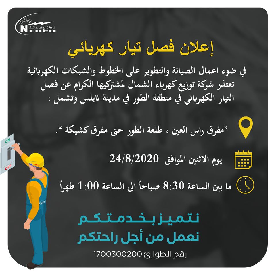 شركة توزيع كهرباء الشمال تعلن عن نيتها فصل الكهرباء لـ4 ساعات في نابلس.