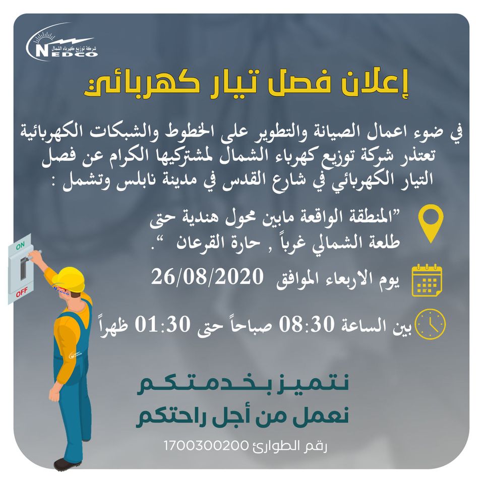 شركة توزيع كهرباء الشمال تعلن عن نيتها فصل التيار الكهربائي في شارع القدس بنابلس، الأربعاء 26.08.2020.