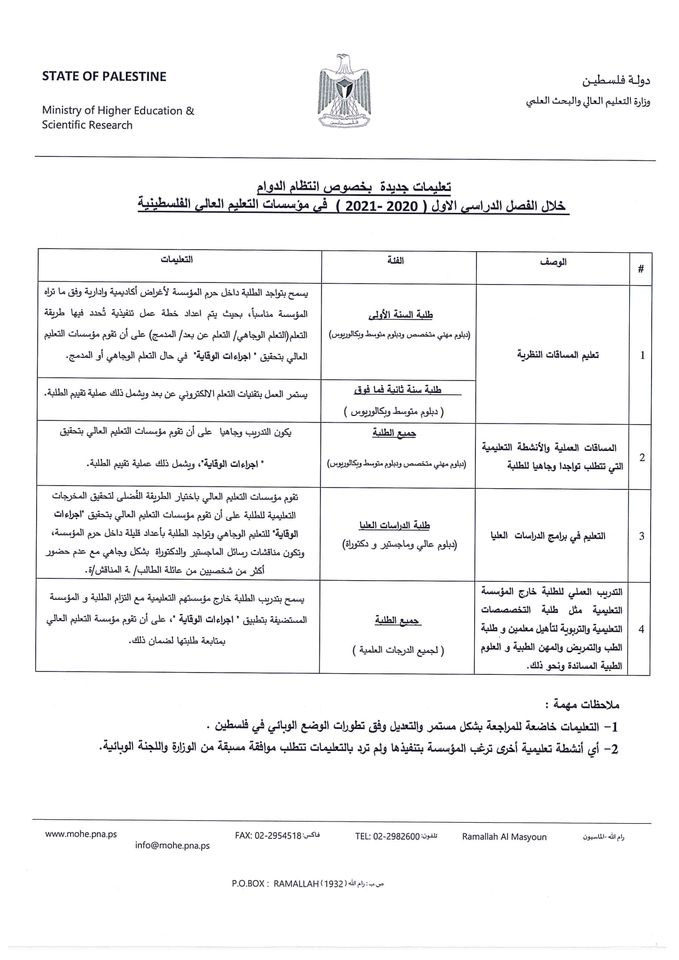 ويظهر أن هناك توجه من قبل الوزارة بالسماح بتواجد طلبة سنة أولى وطلبة الدراسات العليا في الحرم الجامعي لأغراض أكاديمية، مع أخذ الاحتياطات الوقائية اللازمة وتترك التعليمات المجال للمؤسسة لاستخدام الطرق المختلفة في التدريس لهاتين الفئتين حسب ما تراه المؤسسة مناسباً. أما بالنسبة للطلبة القدامى في برامج البكالوريوس، فتؤكد التعليمات على استخدام طرق التعليم الإلكتروني في تدريسهم خلال الفصل الأول، باستثناء المساقات العملية والتدريب ، مع الالتزام بالبروتوكولات الصحية الصادرة عن الجهات المختصة.