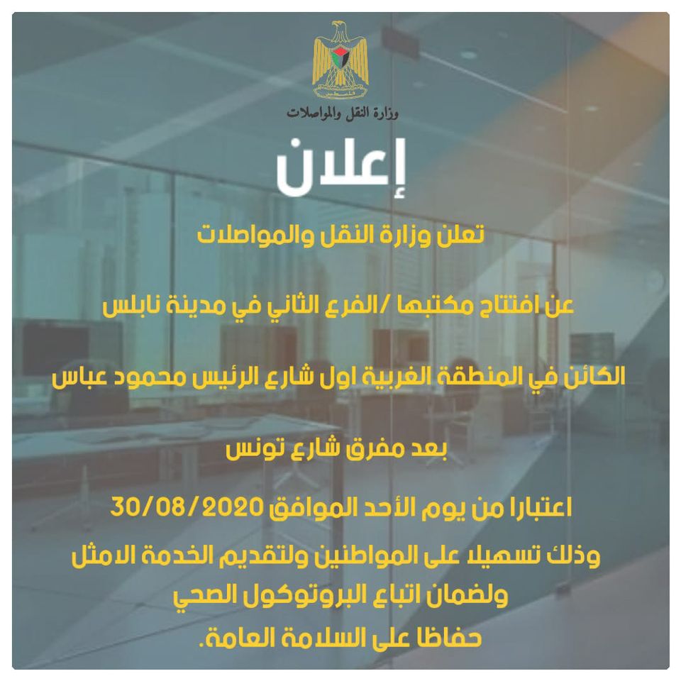 إضافة لموقعها الحالي في نهاية شارع القدس باتجاه حوارة، وزارة النقل والمواصلات تعلن عن افتتاح موقع فرعها الثاني غربي نابلس.