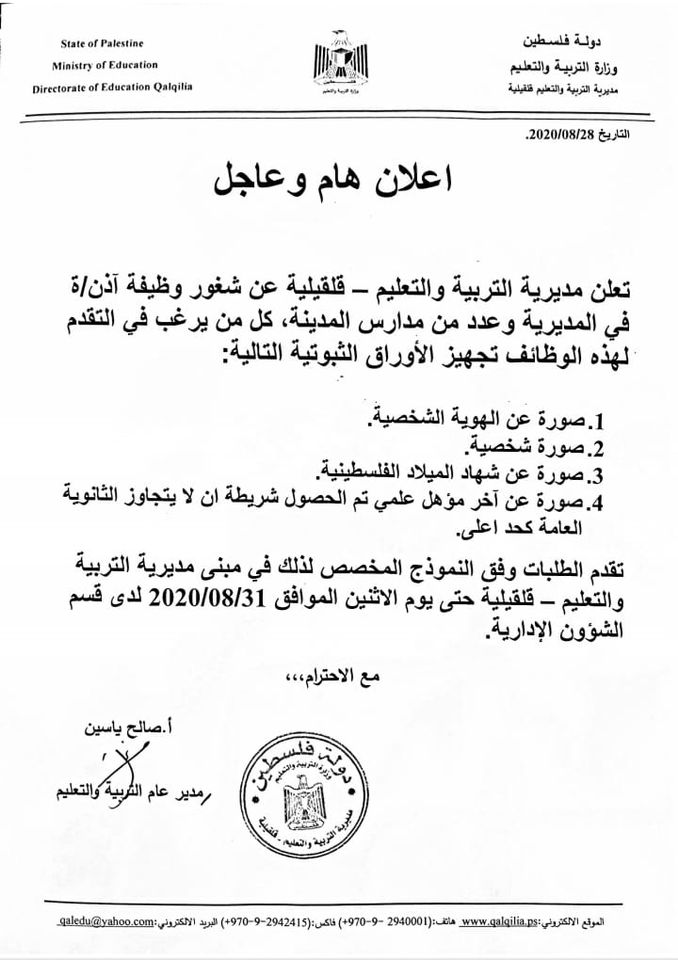 مطلوب آذن/ة في مديرية ومدارس قلقيلية