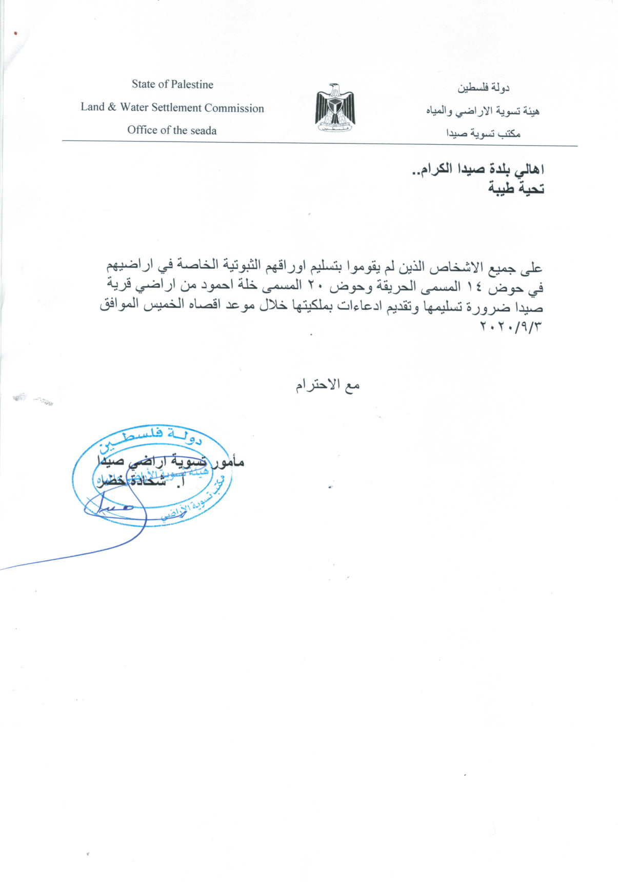 مجلس صيدا القروي يدعو أصحاب أراضي حوض 14 وحوض 20 لتسليم أوراقهم الثبوتية.