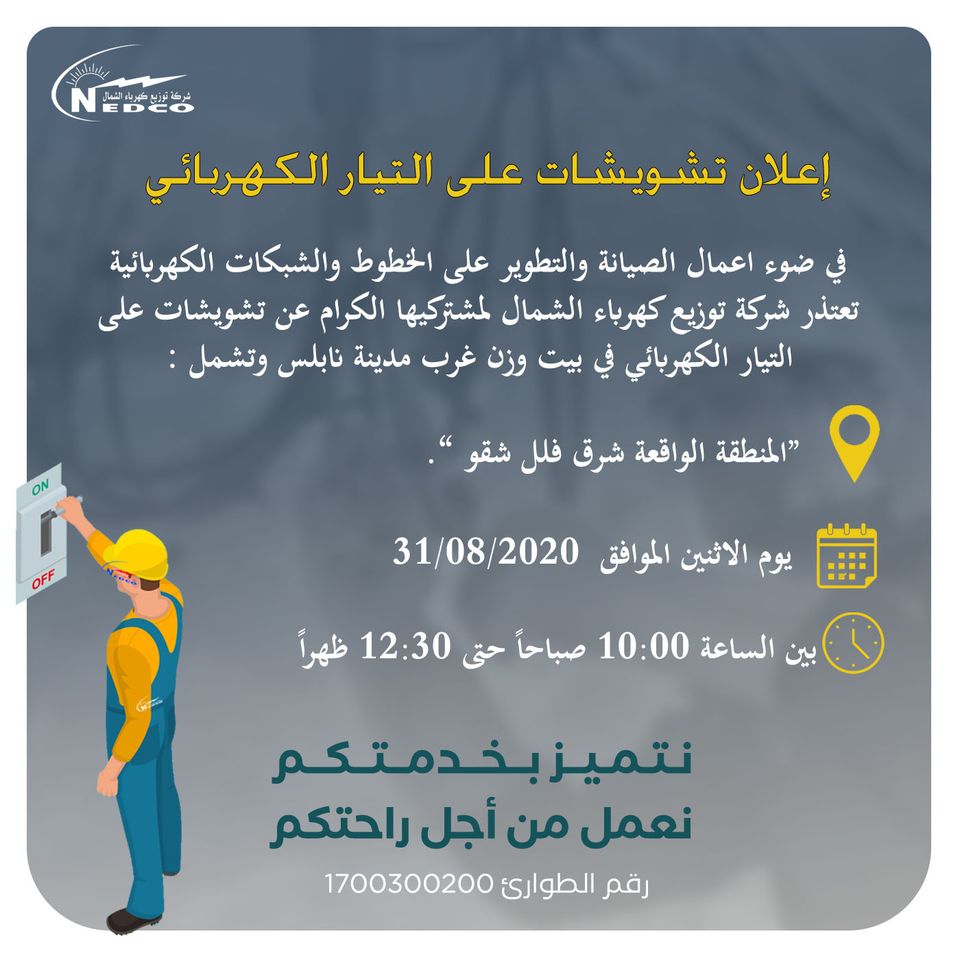 شركة توزيع كهرباء الشمال تعلن عن نيتها فصل الكهرباء لساعتين في بيت وزن غرب نابلس.