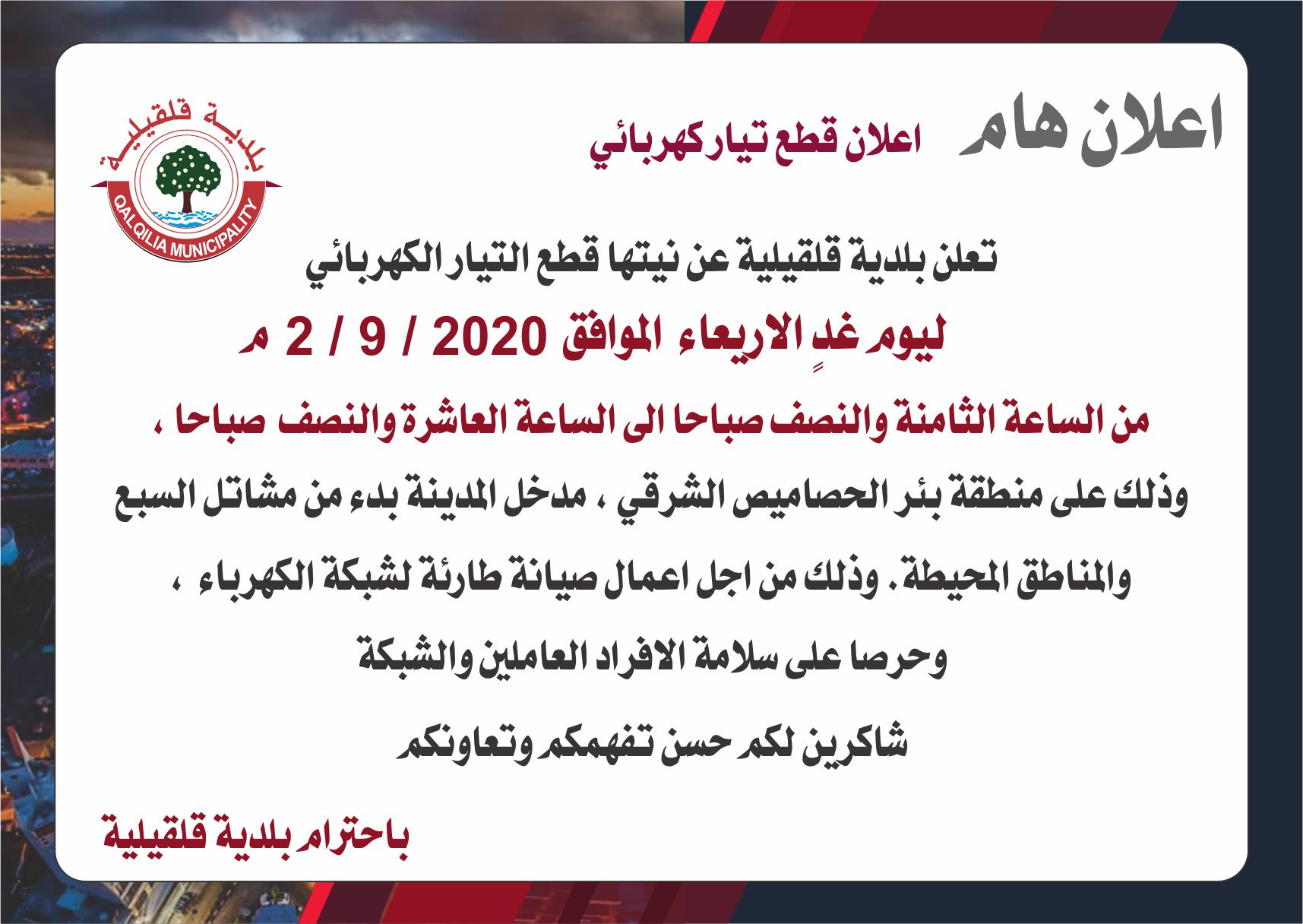 بلدية قلقيلية تعلن عن قطع تيار كهربائي من أجل أعمال صيانة طارئة لشبكة الكهرباء.