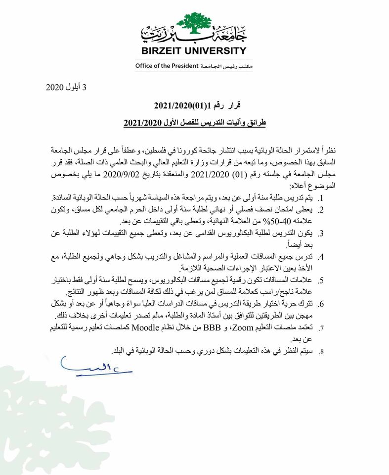 جامعة بيرزيت تنشر طرائق وآليات التدريس للفصل الأول 2020/2021 وتعتمد التعليم الإلكتروني لطلبة السنة الأولى.
