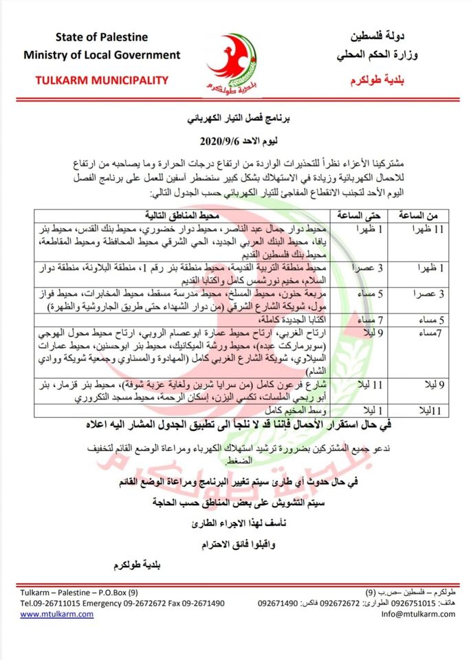 بلدية طولكرم تنشر جدول فصل الكهرباء ليوم الأحد 06.09.2020.