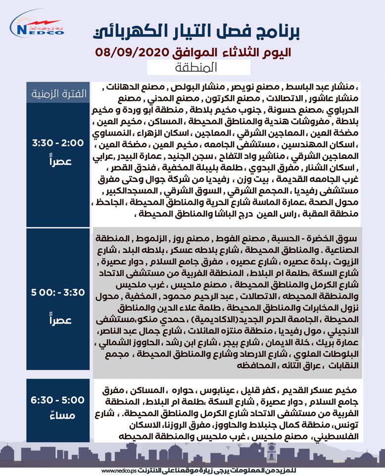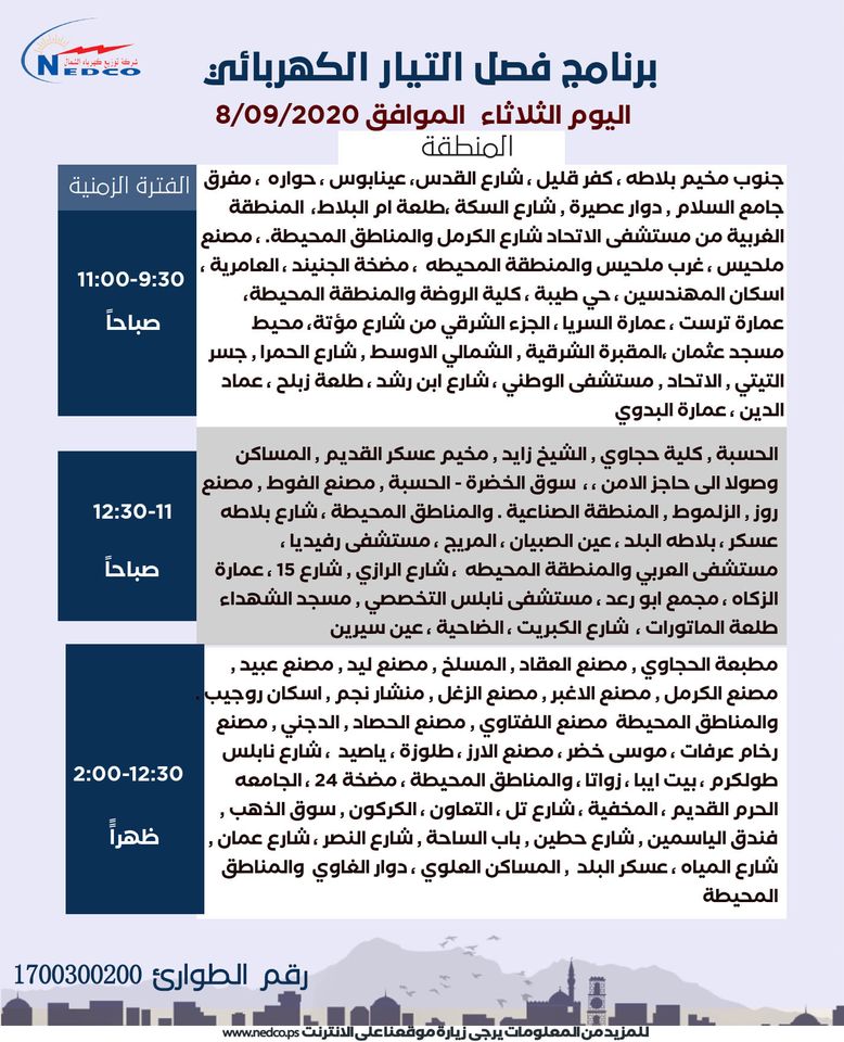 شركة توزيع كهرباء الشمال تنشر مواعيد فصل الكهرباء في نابلس ليوم الثلاثاء 08.09.2020.