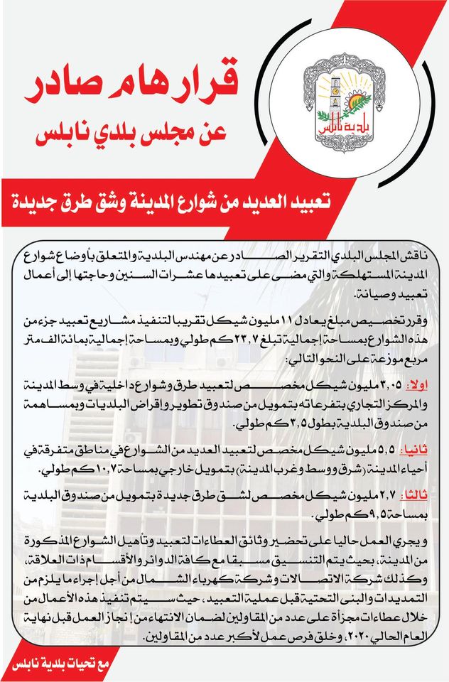 بلدية نابلس توضح للمواطنين قراراتها بخصوص تأهيل وتعبيد بعض شوارع المدينة بمبلغ 11 مليون شيكل.