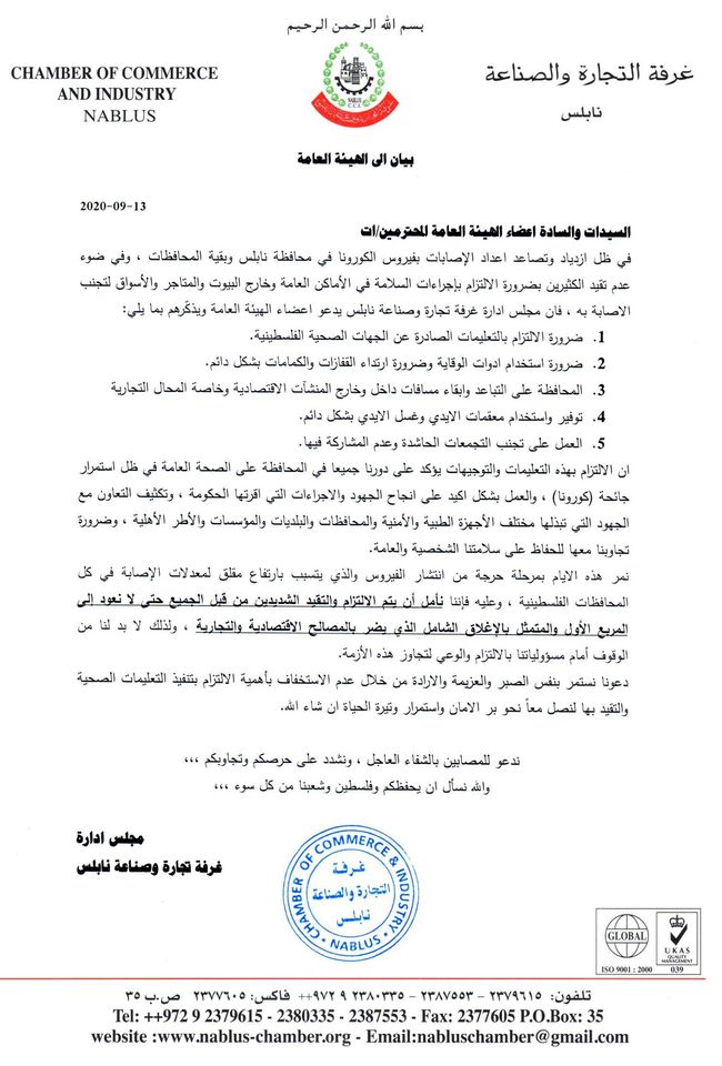 غرفة تجارة نابلس تصدر بيانا تطالب خلاله بالالتزام بالإجراءات الوقائية لمنع العودة إلى فرض الإغلاق الشامل.