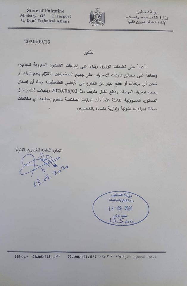 وزارة النقل تدعو المستوردين للالتزام بعدم شراء أو شحن أو استيراد المركبات وقطع الغيار من الخارج تحت طائلة المسؤولية.