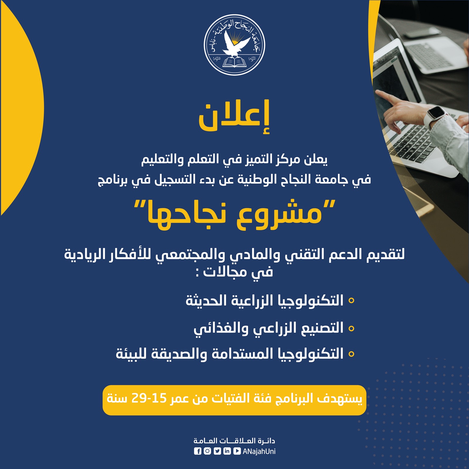 مركز التميز في التعلم والتعليم في جامعة النجاح يعلن عن بدء التسجيل في برنامج مشروع نجاحها.