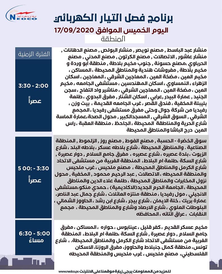شركة توزيع كهرباء الشمال تنشر مواعيد فصل الكهرباء في نابلس ليوم الخميس 18.09.2020.