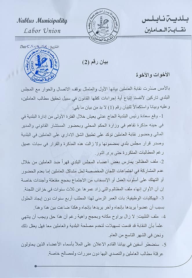 نقابة العاملين في بلدية نابلس تصدر بيانا بخصوص مطالبهم وتعلن تعليق الدوام.