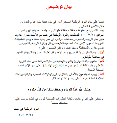 القوى الوطنية في عنبتا تعلن عن انتظام الدوام في مدارس عنبتا، الأحد 27.09.2020، بعد الاتفاق مع مديرية التربية والتعليم على إعادة فتح المدارس وفق الإجراءات الصحة.