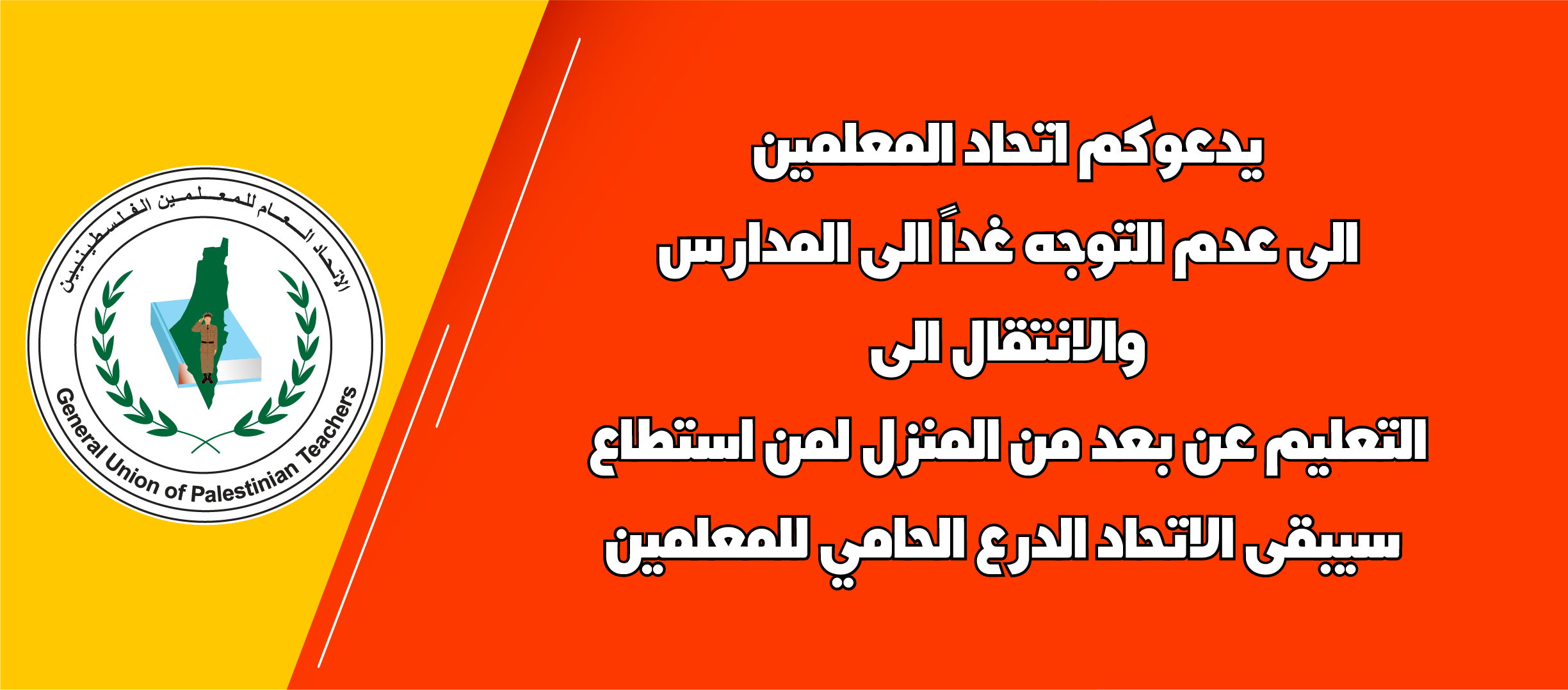 الاتحاد العام للمعلمين ينشر البيان التالي الذي يؤكد فيه على مضيه بالتوجه للتعليم عن بعد ابتداءً من الثلاثاء.