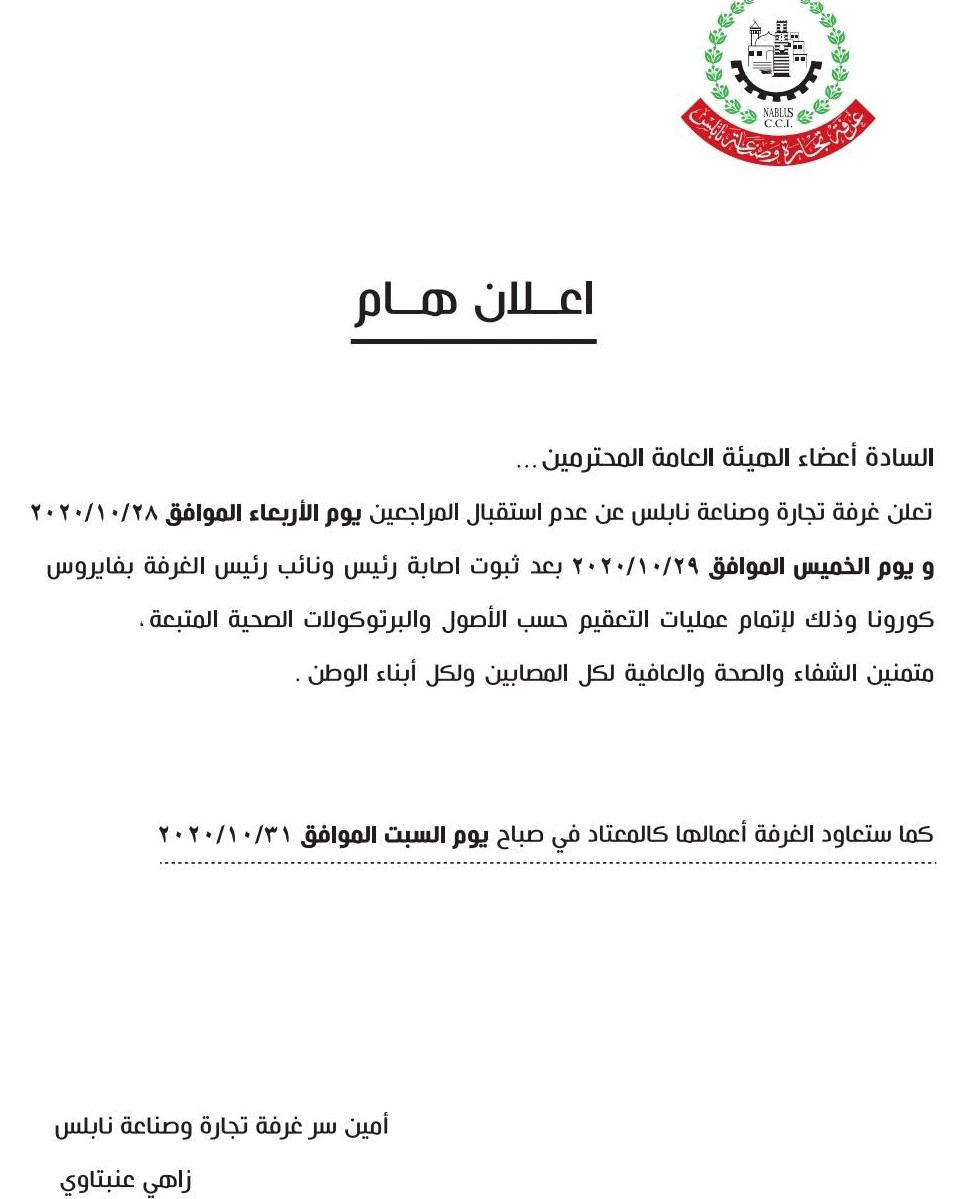 أمين سر غرفة تجارة وصناعة نابلس زاهي عنبتاوي يعلن عن إغلاق مقر الغرفة ليومين بعد ثبوت إصابة الرئيس ونائبه بفيروس كورونا.