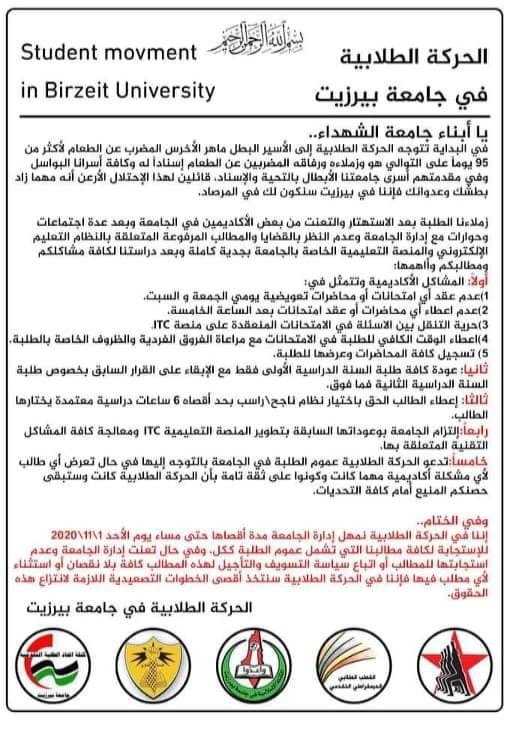 بيان للحركة الطلابية في جامعة بيرزيت