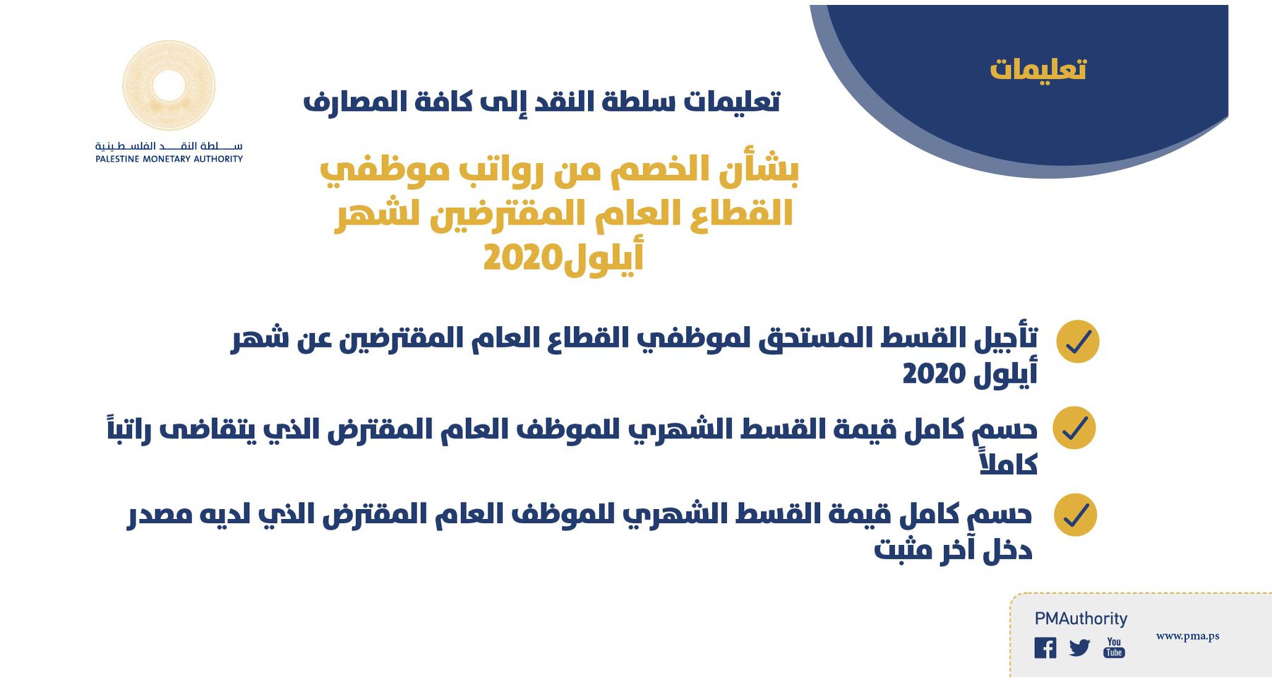 سلطة النقد تصدر تعليمات إلى كافة المصارف وتقرر أن لا خصومات من القسط المستحق على راتب شهر أيلول 2020 لموظفي القطاع العام.