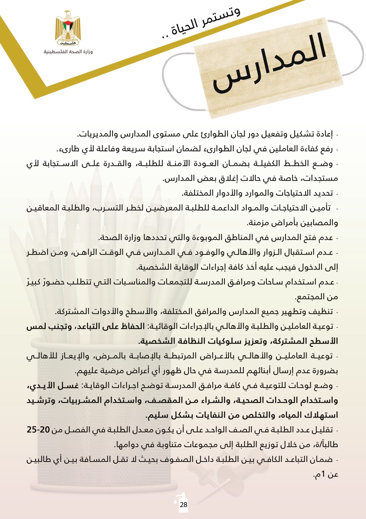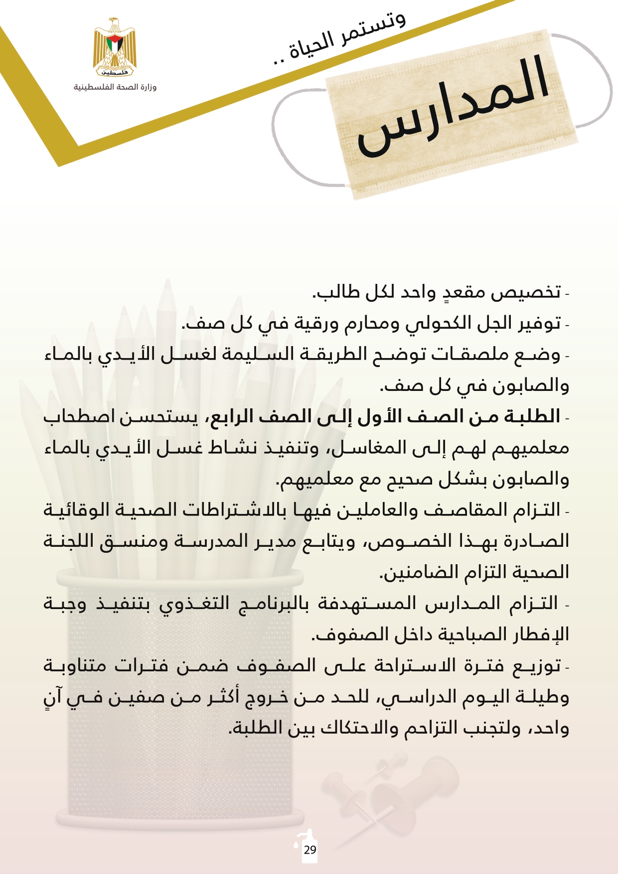 وزارة الصحة الفلسطينية تصدر بروتوكولًا للتعايش مع فيروس كورونا في المدارس