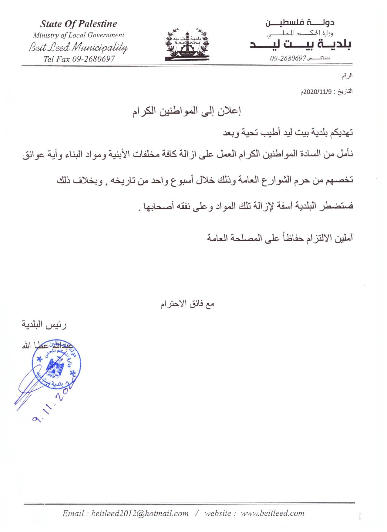 بلدية بيت ليد تعلن للمواطنين بضرورة إزالة كافة مخلفات الأبنية من الشوارع وتحدد مهلة لذلك.