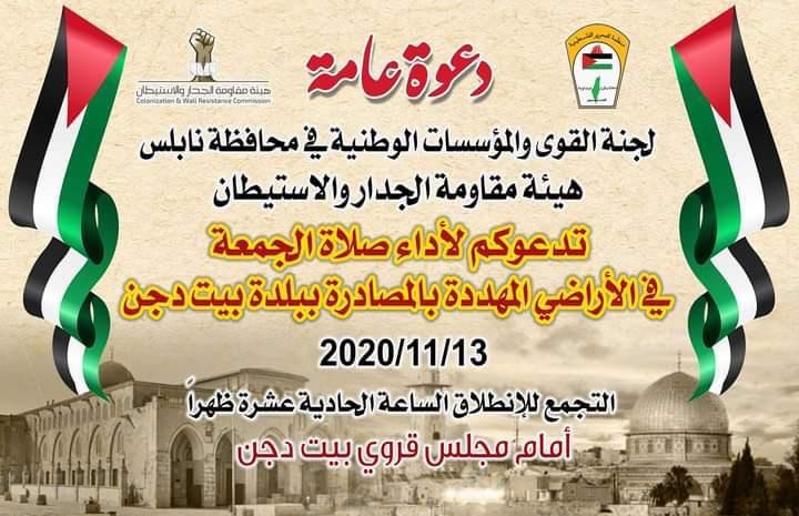 لجنة القوى والمؤسسات الوطنية في نابلس تدعو لأداء صلاة الجمعة في الأراضي المهددة بالمصادرة في بيت دجن.