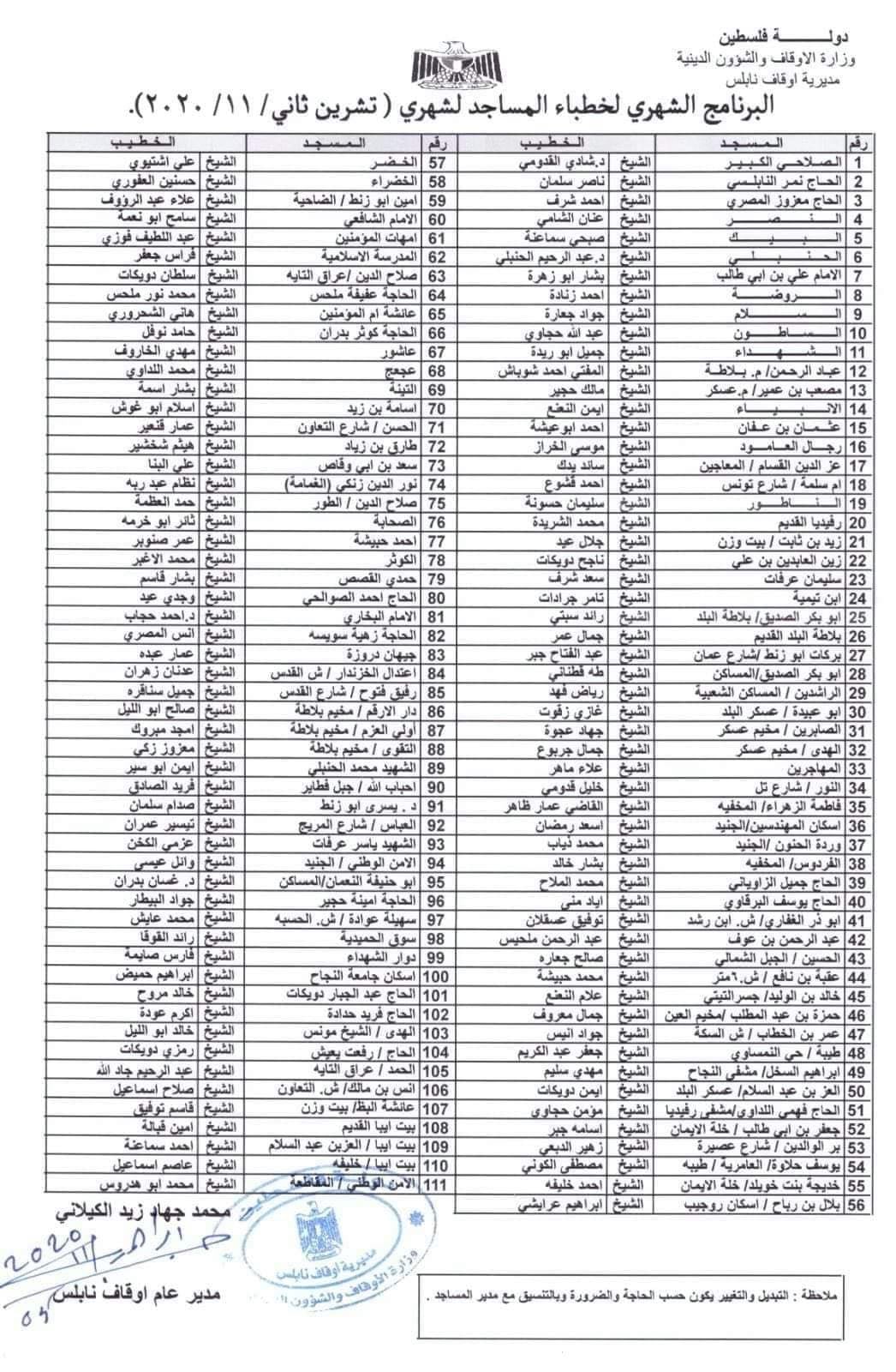 أسماء خطباء صلاة الجمعة في مساجد مدينة نابلس وضواحيها ليوم الجمعة 13.11.2020.