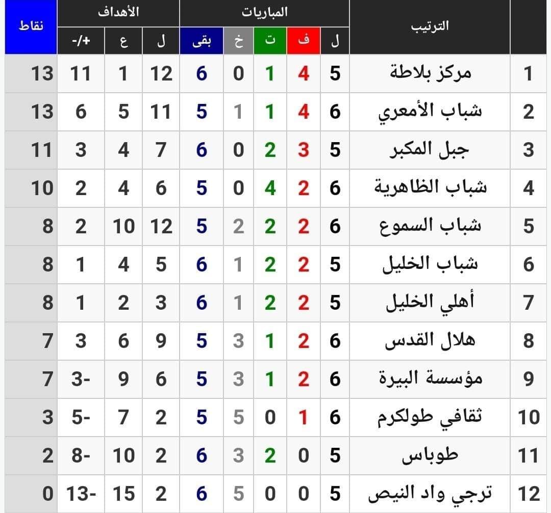 مركز شباب بلاطة يحافظ على صدارة الدوري في أسبوعه السادس. ويساويه في النقاط (13) الأمعري بست مباريات وسيلعب بلاطة مباراته السادس بعد.