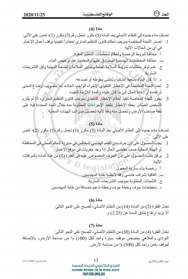 قرار مجلس الوزراء رقم (15) لسنة 2020، بتعديل نظام الأبنية والتنظيم للهيئات المحلية رقم (6) لسنة 2011، والذي صدر بالعدد (173) من جريدة الوقائع الفلسطينية.