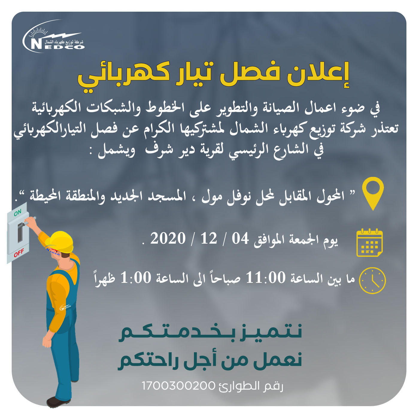 شركة توزيع كهرباء الشمال تعلن عن فصل التيار الكهربائي في منطقة دير شرف، الجمعة 04.12.2020، وذلك لأعمال الصيانة والتطوير على الشبكات الكهربائية.