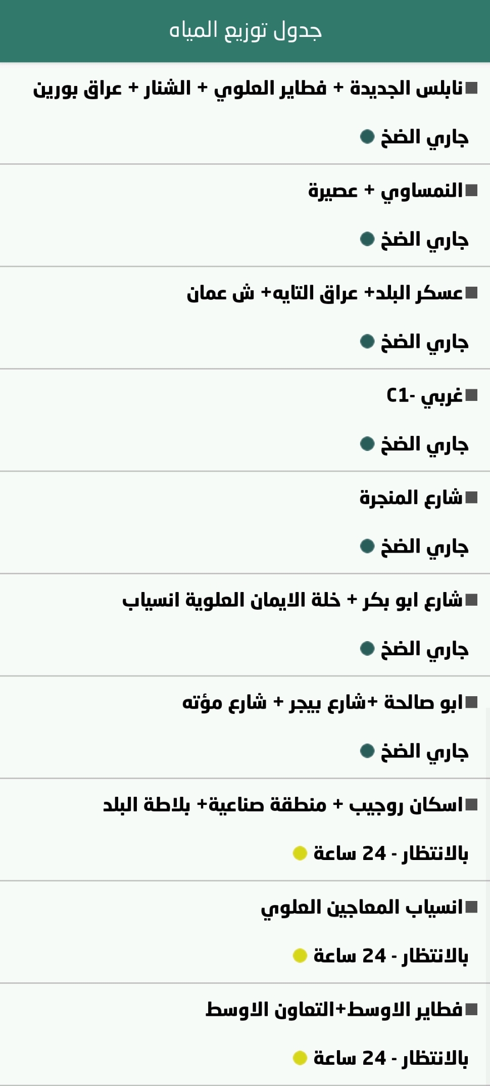 جدول توزيع المياه في نابلس وضواحيها ليوم الثلاثاء 15.12.2020.